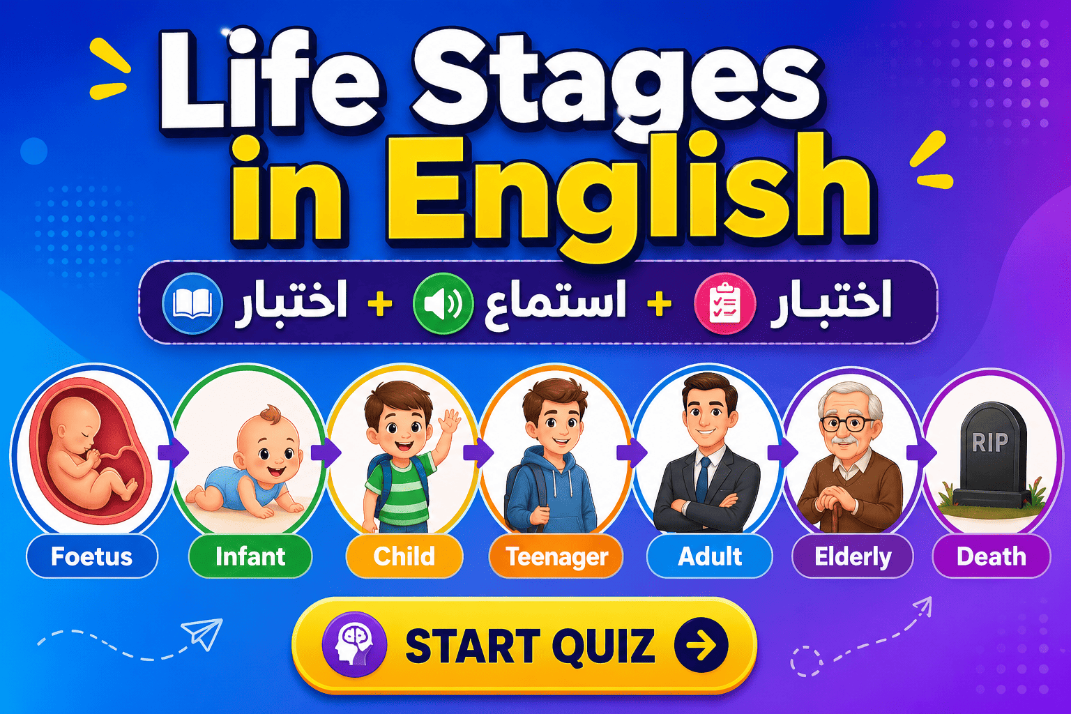 في هذا الدرس ستتعرف على أهم مراحل الحياة من الجنين إلى الوفاة بطريقة سهلة وبسيطة، مع إمكانية الاستماع للنطق الصحيح لكل كلمة، ثم اختبار نفسك للتأكد من فهمك.